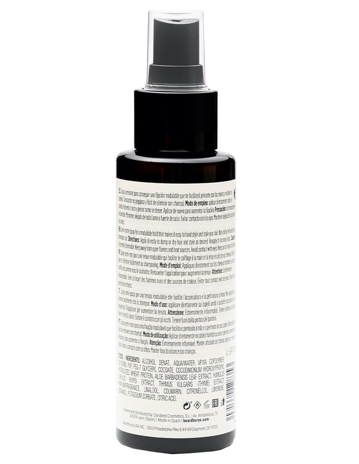 Fijación fuerte sin rigidez con el Spray de peinado de Beardburys Essentials. Este spray fijador de peinado es flexible, no deja residuos y cuida tu cabello hidratándolo y reforzando su estructura capilar.