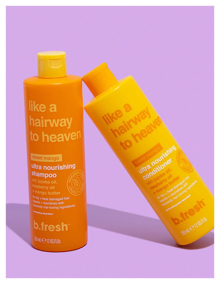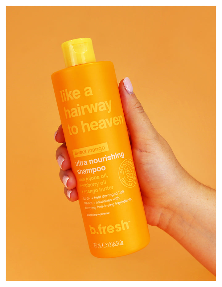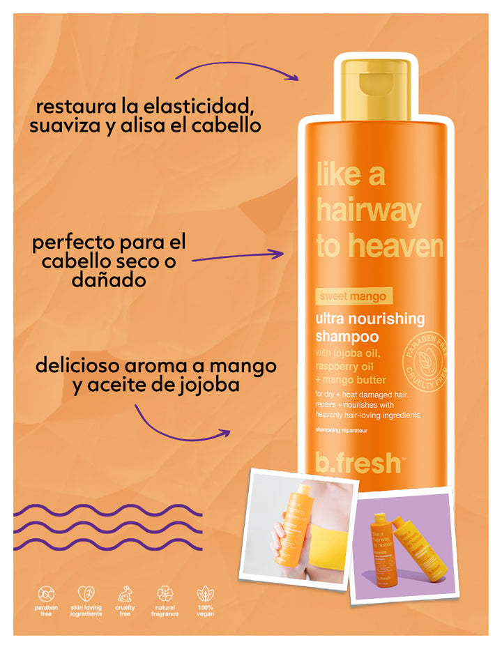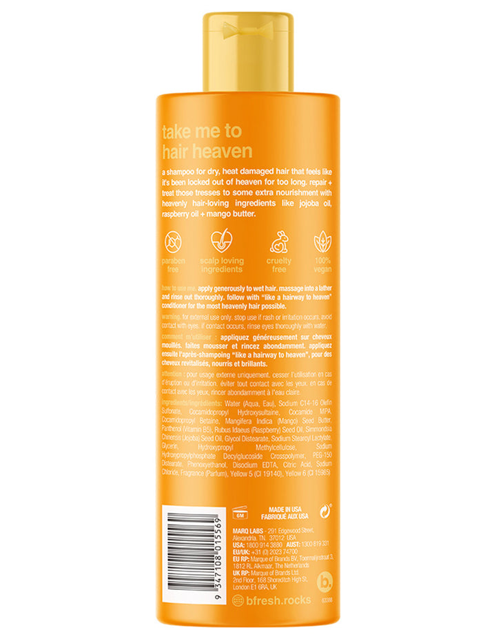 un shampoo ultra nutritivo para cabello seco y dañado por el calor que se siente como si hubiera estado excluido del cielo durante demasiado tiempo. Aceite de jojoba, aceite de frambuesa + manteca de mango reparan, nutren y tratan ese cabello.