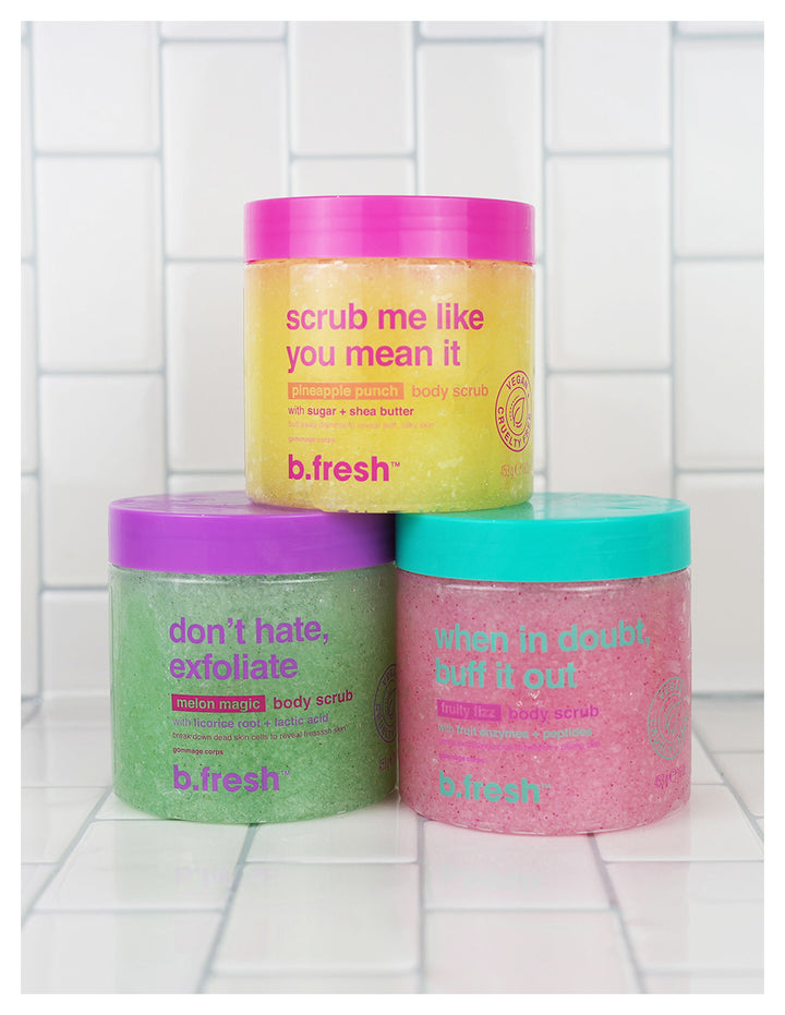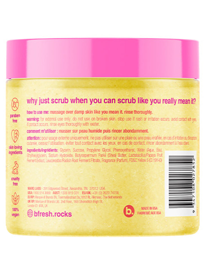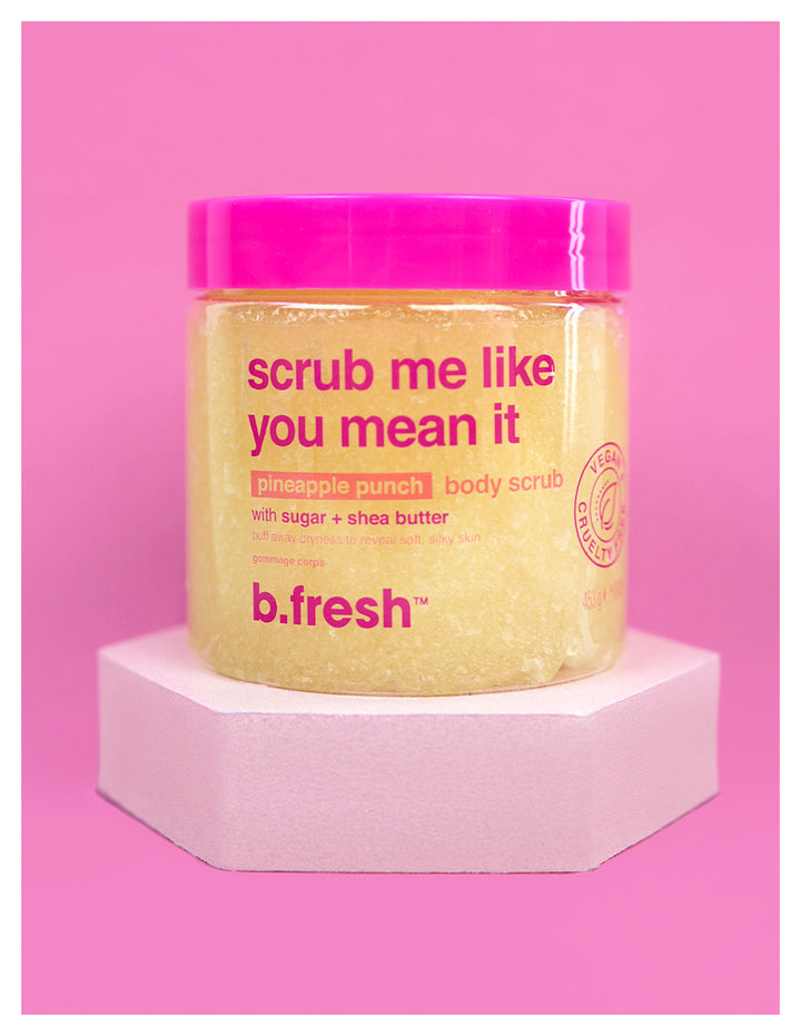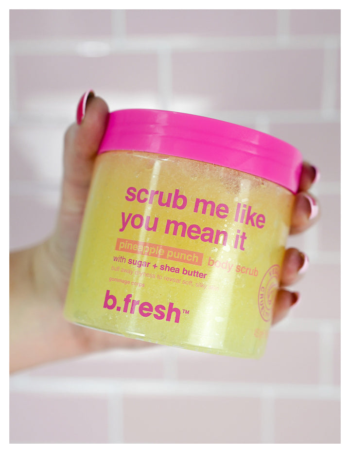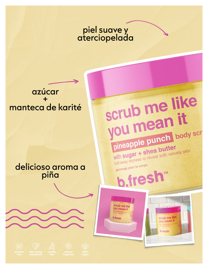No me exfolies solo. ¡Frótame como si me quisieras! Elimina las células cutáneas secas y muertas con este azúcar combinado con manteca de karité calmante para revelar la piel suave y aterciopelada que se esconde debajo. Rematado con una fragancia intensa a piña para que huelas y te sientas realmente fresca y bonita.
