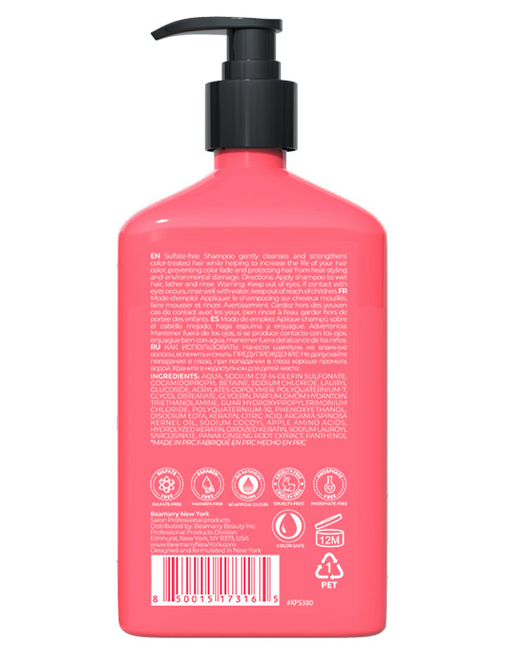 El shampoo sin sulfatos limpia y fortalece suavemente el cabello teñido mientras ayuda a aumentar la vida útil del color, evitando la decoloración y protegiendo el cabello del peinado con calor y del daño ambiental.