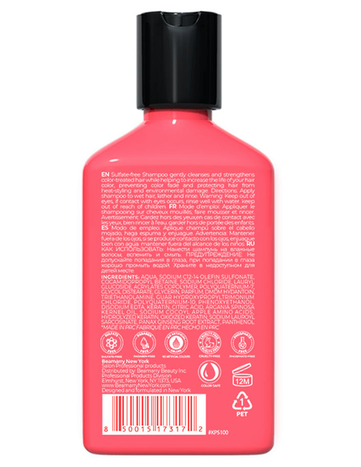El shampoo sin sulfatos limpia y fortalece suavemente el cabello teñido mientras ayuda a aumentar la vida útil del color, evitando la decoloración y protegiendo el cabello del peinado con calor y del daño ambiental.