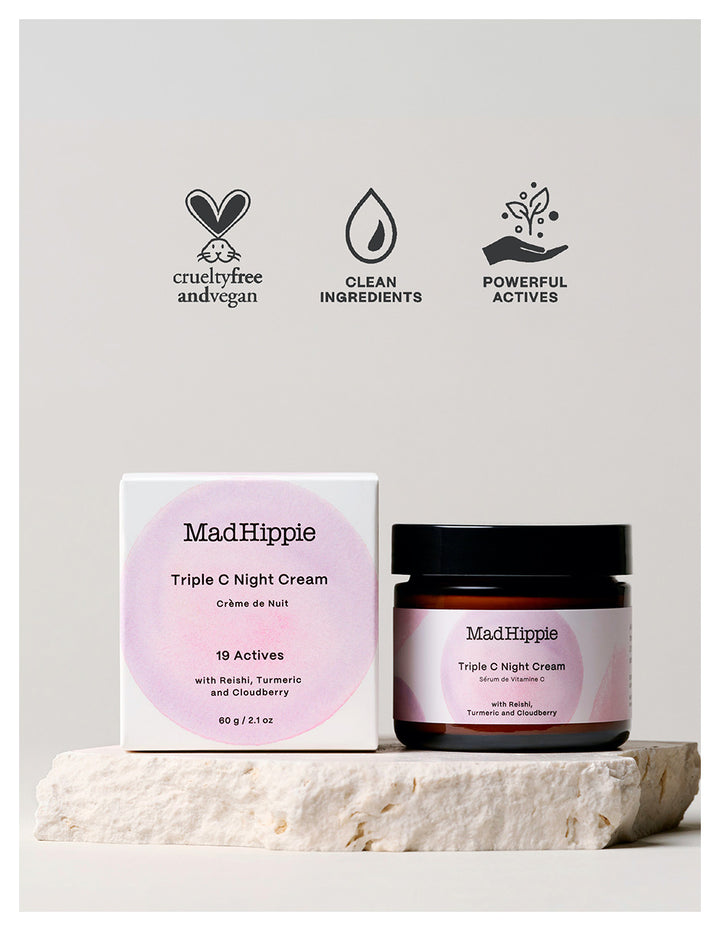 - Triple C - Tres formas biodisponibles de vitamina C, cada una con procesos biológicos distintos, unen fuerzas para rejuvenecer y proteger la piel de la exposición a factores estresantes diarios. Tetrahexyldecyl Ascorbate, Magnesio Ascorbyl Phosphate & Ascorbyl Glucoside, todas las formas increíblemente biodisponibles y eficaces de vitamina C, trabajan para aclarar la piel y reducir la apariencia de decoloración, mientras que disminuye la aparición de líneas finas y arrugas.